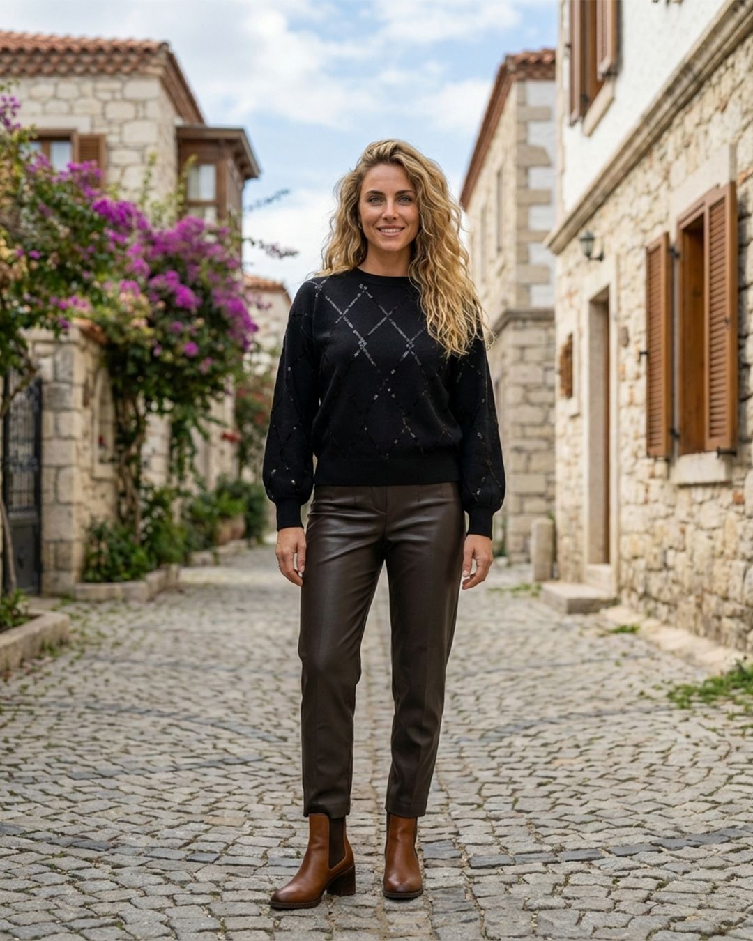 Hafif Balon Kol Çapraz Pullu Sıfır Yaka Kazak.