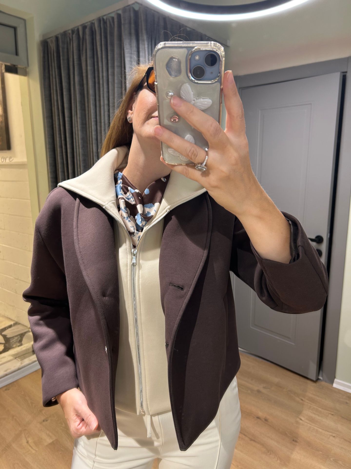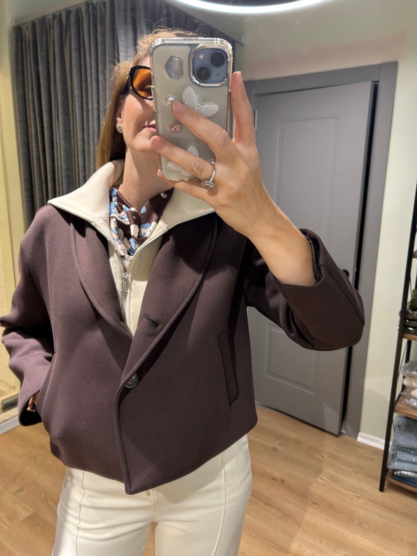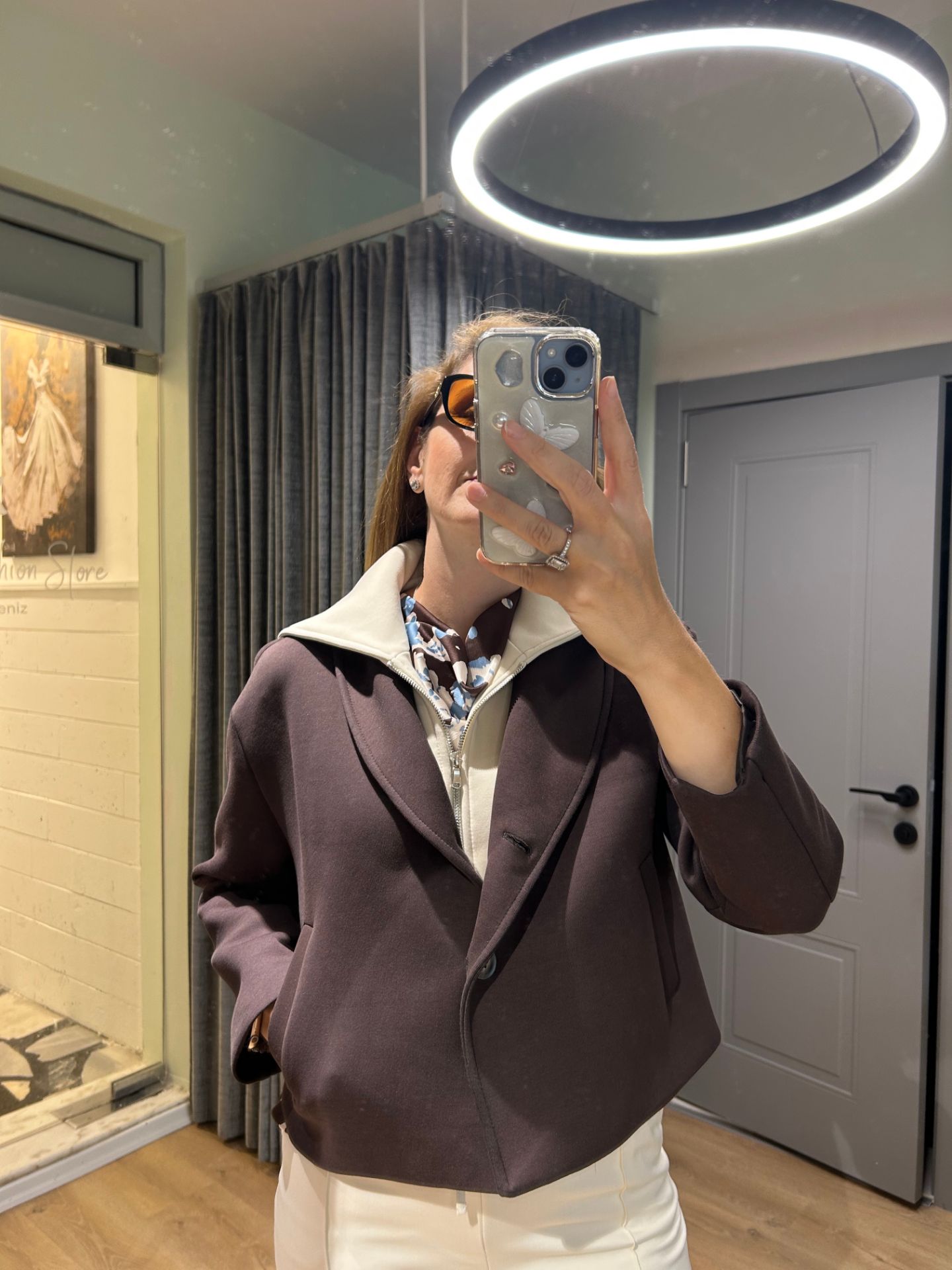 Scuba Kumaş Çift Parça Görünümlü Kapüşonlu Rahat Kalıp Mont Kahverengi.