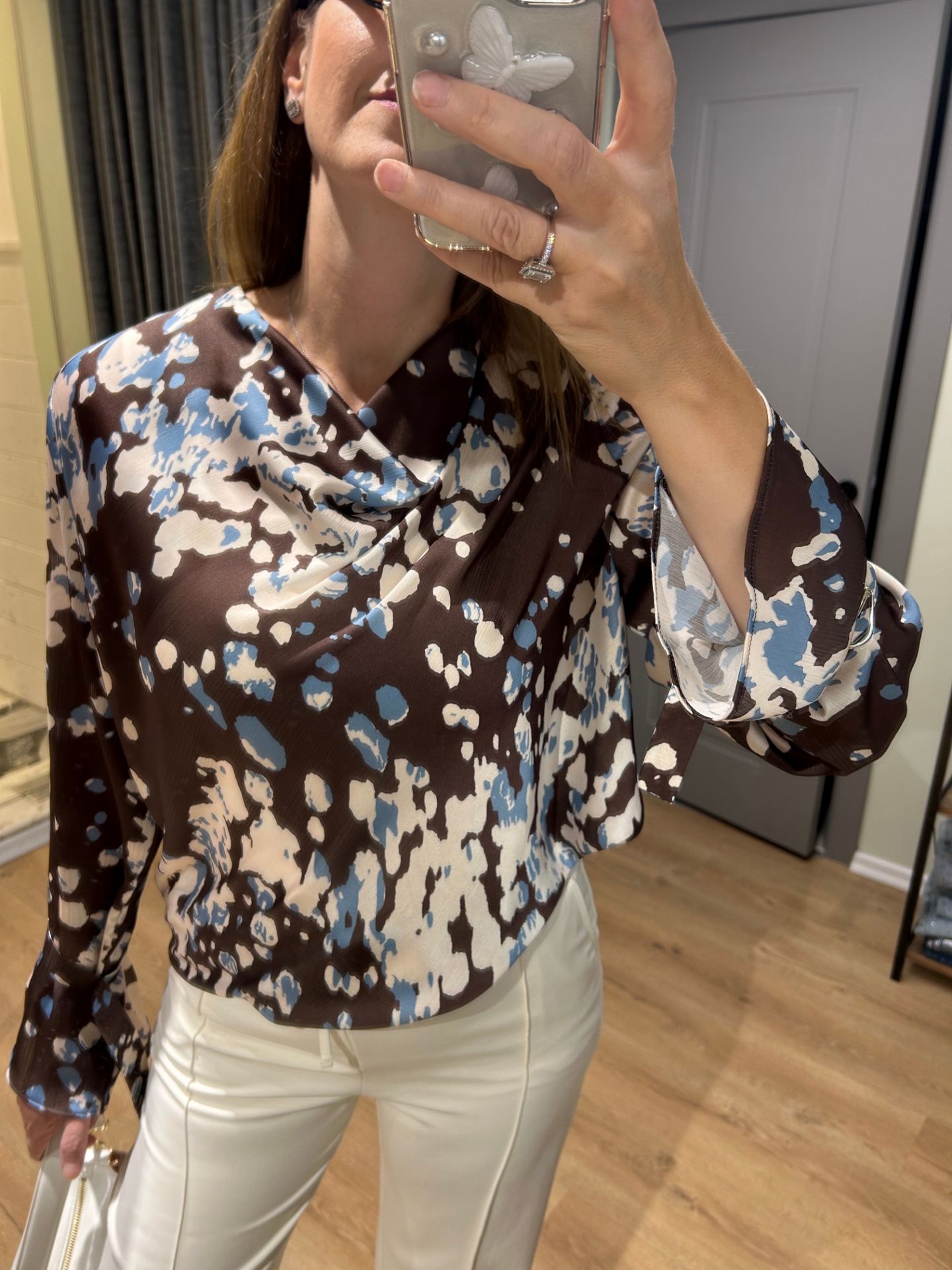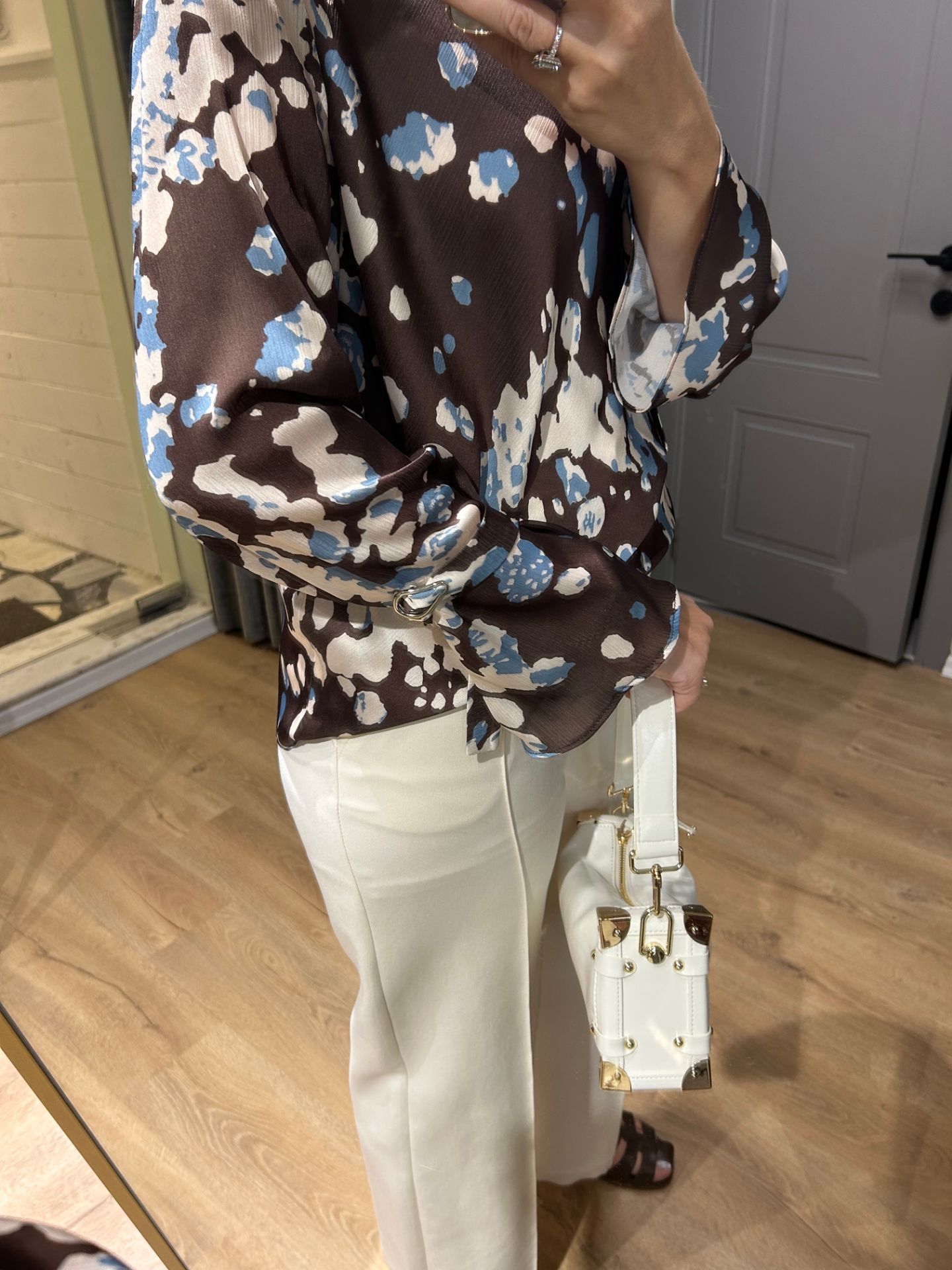 Degaje Yaka Geniş Kol Ucu Rahat Kalıp Saten Bluz Kahve Rengi.
