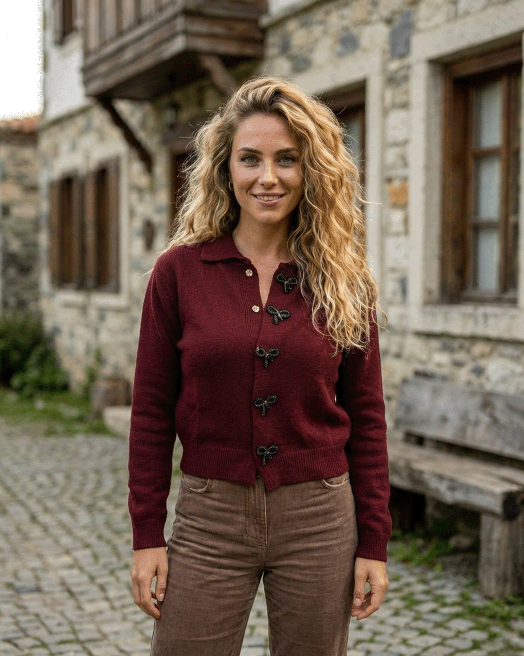 Fiyonk çıt çıt düğmeli hırka Bordo