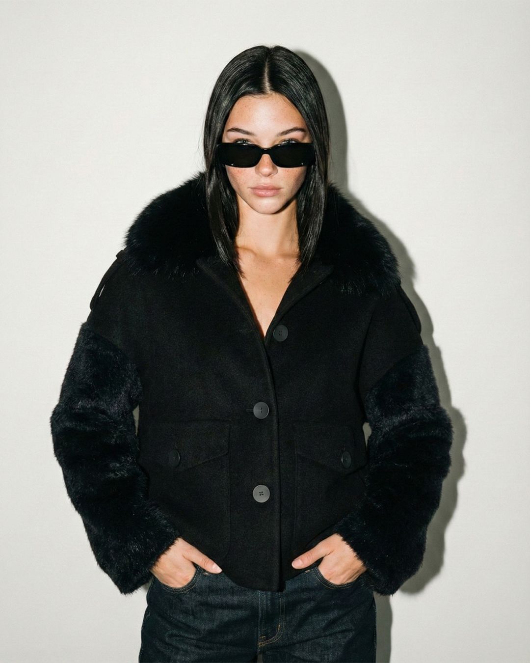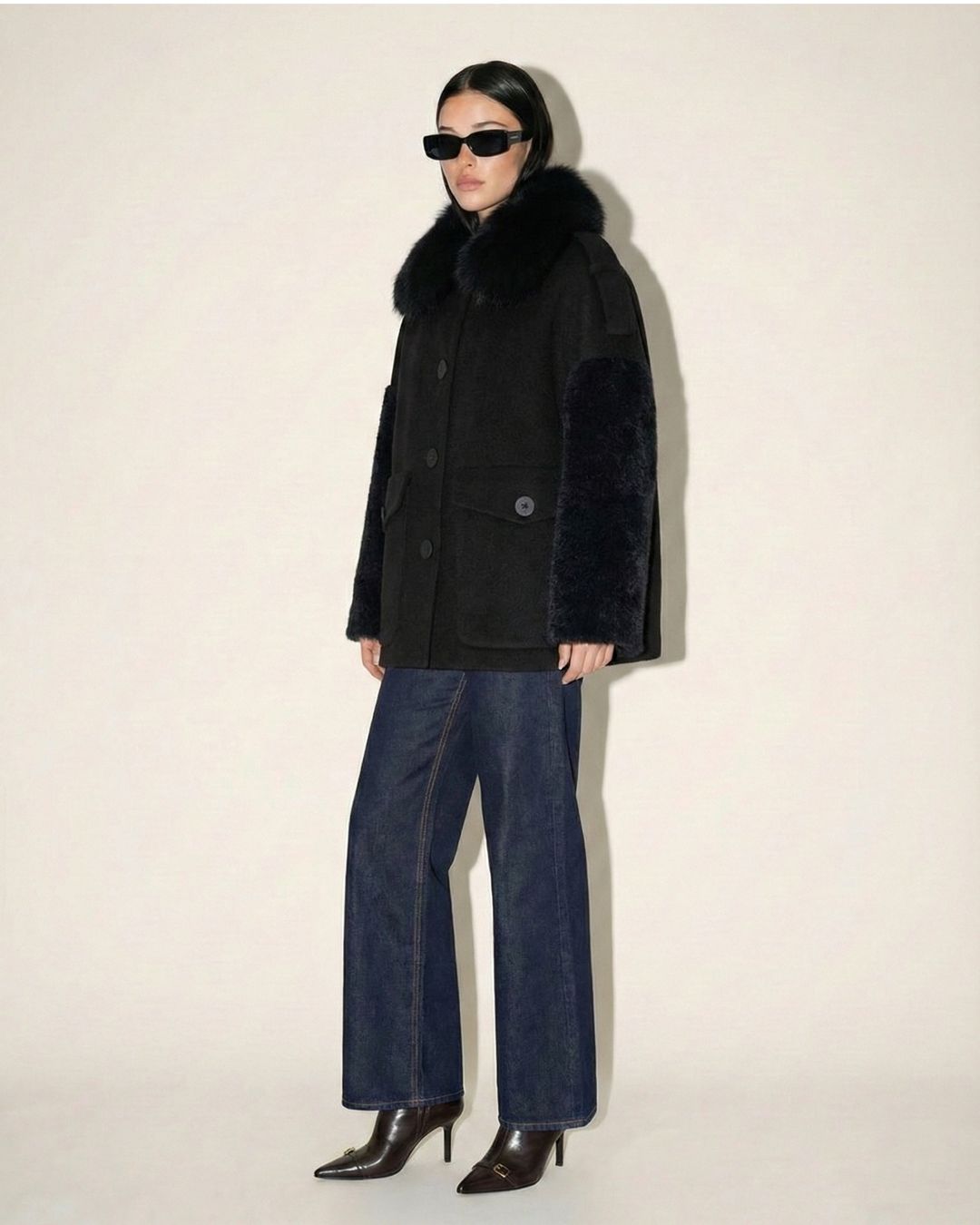 Yaka Kürkü Çıkabilir Oversize Kalıp Düğmeli Kaşe Kaban Siyah.